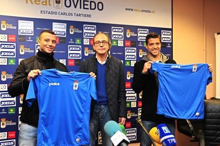 prevista llegaban a la sala de prensa los dos nuevos fichajes del Real Oviedo,